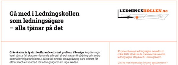 Krav på att använda Ledningskollen har funnits med i Robust fibers anvisningar sedan den första utgåvan. I den nu publicerade upplagan av Robust fibers anvisningar (version 1.3.1) har anvisningarna utökats med en ny bilaga – bilaga 8, Ledningskollen. Läs mer om bilagan. | |  | |